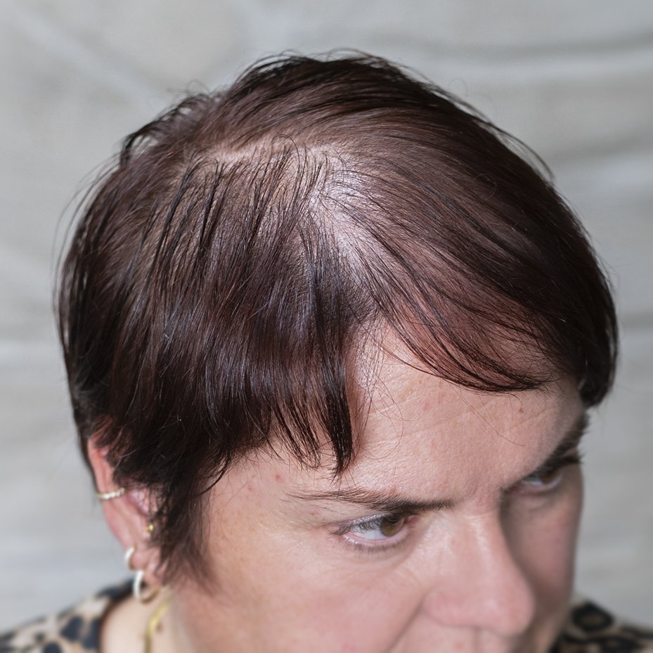 Viele Kundinnen kämpfen nicht mit vollständigem Haarausfall, sondern mit konkreten Veränderungen: lichter werdende Scheitelbereiche, zurückweichende Haarlinien, Geheimratsecken oder hormonell bedingtes Ausdünnen. Für diese Fälle existieren bislang kaum überzeugende Lösungen.